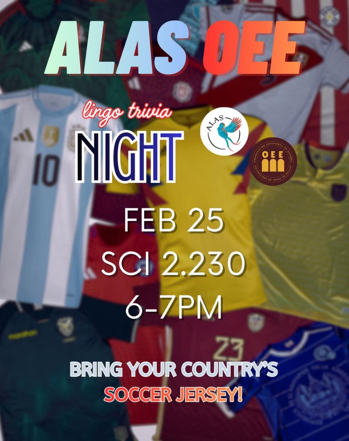OEE and ALAS invite you to join us for trivia about lingo in different Hispanic countries! Rep your country's soccer jersey!